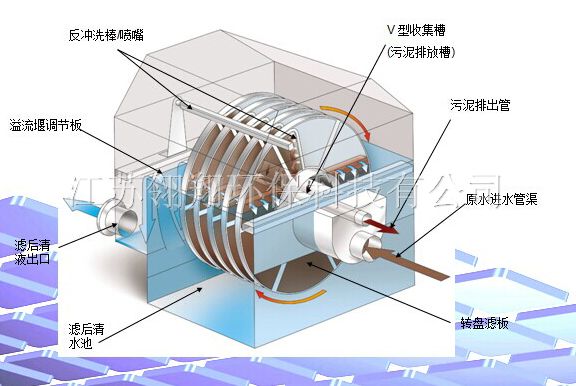半浸沒式轉(zhuǎn)盤過濾器由中心轉(zhuǎn)筒、盤片、反洗系統(tǒng)和配套電氣控制系統(tǒng)等組成。轉(zhuǎn)盤固定在中心轉(zhuǎn)筒周圍, 并與中心轉(zhuǎn)筒具有連通孔。原水(污水)經(jīng)過中心轉(zhuǎn)筒流出過濾盤片,濾網(wǎng)為316L不銹鋼網(wǎng),過濾孔徑可達 10um。原水通過過濾網(wǎng)過濾后,清水流進池內(nèi),隨著過濾的進行,濾網(wǎng)內(nèi)側(cè)的截留雜質(zhì)不斷增加,過濾壓差隨 之增加,透過濾網(wǎng)的水量減小,當雜質(zhì)堆積到一定程度,濾池液位降到設(shè)定值,反沖洗衣裝置開始運行,將過濾 網(wǎng)內(nèi)側(cè)堆積的雜質(zhì)反洗出。沖洗衣后污水雜質(zhì)吸入污水管道,然后排出裝置外。反洗時轉(zhuǎn)盤旋轉(zhuǎn),直至過濾網(wǎng)全 部經(jīng)過清洗,反洗停止,重新進入靜止過濾過程,以此循環(huán)操作。